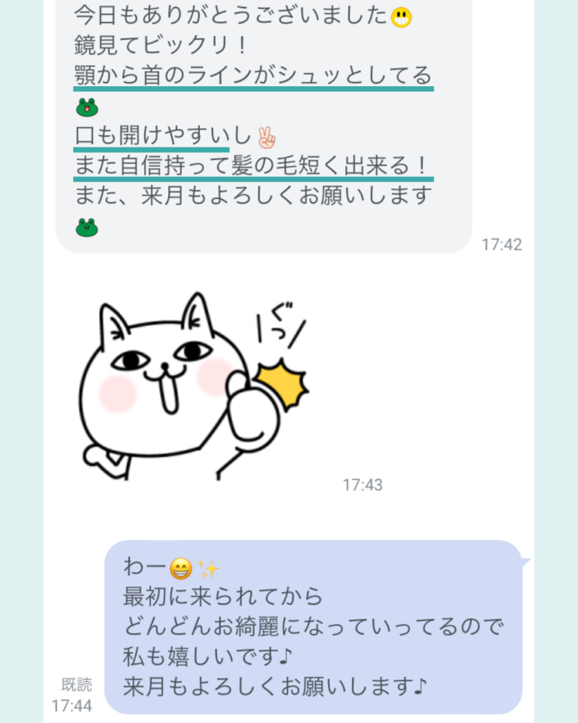 小顔矯正 お客様の声 【お客様の声】自信を持って髪の毛を短くできる! 2022年8月22日 今日はyukariが投稿します♪ お客様からのご感想の紹介です♪2021年11月から通ってくださってるお客様😊いっつもお話しするのが楽しい♪ 毎月通っていただきどんどんお顔がスッキリされてます😊噛みしめがあるとのことなので咬筋を念入りにほぐしています♪ ショートカットがほんとにお似合い😌お客様がどんどん綺麗になると私も嬉しいなぁ💕感想ありがとうございました♪ 咬筋、エラにお悩みの方が本当に多いのでさらに効果的な施術ができないか現在研究中です✏️ カテゴリーカテゴリー カテゴリーを選択 お知らせ (16) 自己紹介 (12) 小顔矯正 (88) 小顔ビフォーアフター (45) 毛穴エクストラクション (49) 毛穴ビフォーアフター (32) お客様の声 (18) インスタ投稿 (136) インテリア (10) 美容・健康 (41) 自然 (9) もふもふ (4) セラージュ周辺のお店 (6) キャロケ (1) おいしいもの (9) chieのおすすめ (16) 六甲だより (10) 家族 (7) 旅 (3) 開店準備 (12) アーカイブ アーカイブ 月を選択 2026年4月 (1) 2026年1月 (1) 2025年11月 (2) 2025年8月 (1) 2025年7月 (1) 2025年6月 (1) 2025年3月 (2) 2025年2月 (1) 2024年12月 (2) 2024年11月 (2) 2024年10月 (2) 2024年9月 (2) 2024年8月 (4) 2024年7月 (2) 2024年6月 (3) 2024年5月 (1) 2024年2月 (2) 2024年1月 (2) 2023年12月 (4) 2023年11月 (4) 2023年9月 (4) 2023年8月 (1) 2023年7月 (1) 2023年6月 (1) 2023年5月 (4) 2023年4月 (3) 2023年2月 (6) 2023年1月 (5) 2022年12月 (14) 2022年11月 (16) 2022年10月 (17) 2022年9月 (4) 2022年8月 (4) 2022年5月 (1) 2022年4月 (3) 2022年3月 (1) 2022年2月 (7) 2022年1月 (10) 2021年12月 (6) 2021年11月 (8) 2021年10月 (6) 2021年9月 (6) 2021年8月 (5) 2021年7月 (8) 2021年6月 (11) 2021年5月 (1)